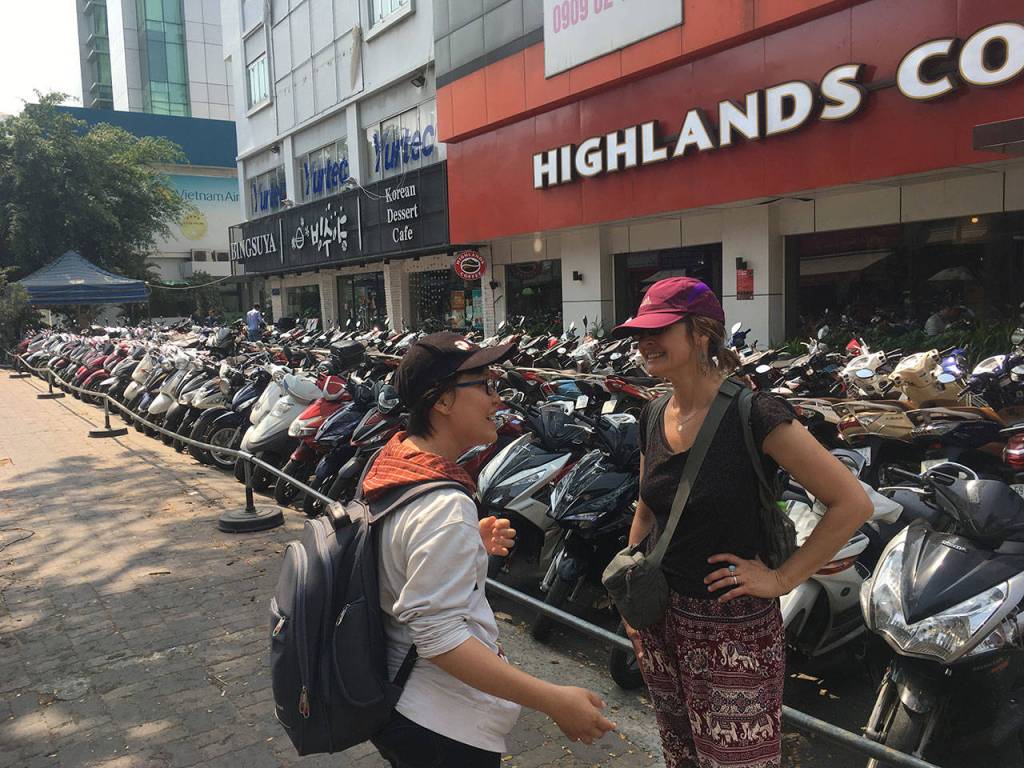Hanoi has a population of about 12 million people, and it has 6 million gas-powered scooters. The streets are so clogged with scooters — horns beeping, blinkers flashing, all swerving in and around each other at intersections — that it’s hard to visualize unless you’ve seen it in person. For the first couple of days, I just watched the traffic, mesmerized. My jaw would have dropped, except that I wanted to keep my mouth closed against the dust and pollution.