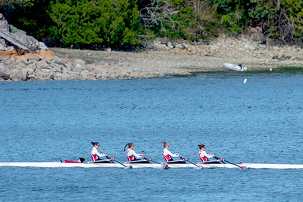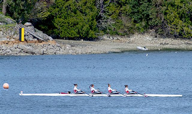 Kicking things off for the club were sophomores Ros Bellscheidt and Ava Lorentzen, who blitzed a field of 18 crews to win the JV girls’ double by nine seconds. And in what may have been one of the greatest performances so far by the young club, the novice boys’ coxed four (Joe Barnes, Braden Edwards, Simon Grant and Davis Kelly, coxed by Keziah Rutschow) found its groove and fantastic form to win gold over a strong squad from the Vashon Island Rowing Club.