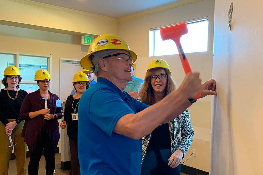Vashon Community Care resident John Whitney hammers out a piece of wall in the facility to mark the start of construction on the memory care wing on Thursday, Oct. 24 (Kevin Opsahl/Staff Photo).