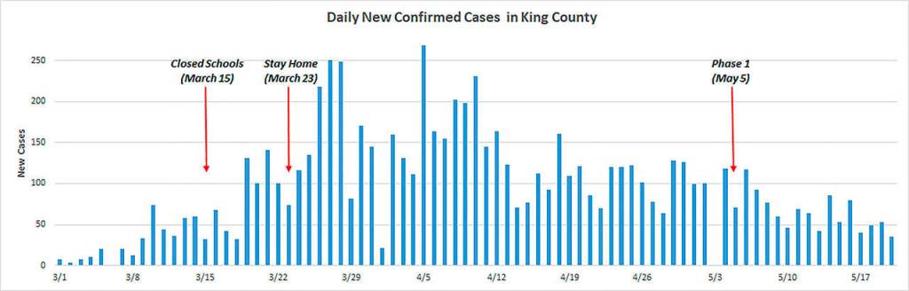 Phase 2 timing: The Governor’s office has been moving on plans for reopening businesses and other activities in Phase 2. Guidance has been issued for retail and restaurants, professional services, increased outdoor recreation services and personal services. There are currently more than 20 counties that have been granted Phase 2 status. However, King County remains well over the threshold for new cases (see graph on this page).