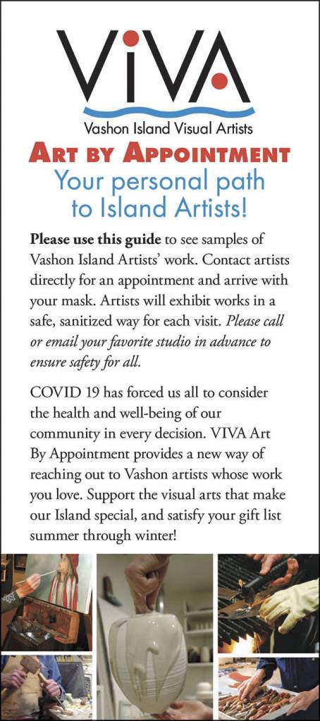 A colorful, 12-page brochure — “VIVA Art by Appointment: Your Personal Path to Island Artists,” has now been published, listing 70 art studios on Vashon that are now booking safe, socially distant private appointments.