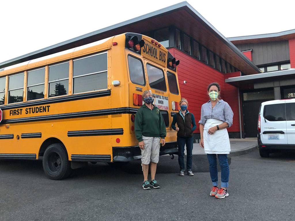 At 6:30 a.m. Tuesday, Sept. 1, Vashon School District Director of Food Service Lisa Cyra (foreground), Char Phillips (left) and Heather Mcmillen (right) loaded up a school bus, filled with nutritious breakfasts and lunches, to head out to Vashon School District students.