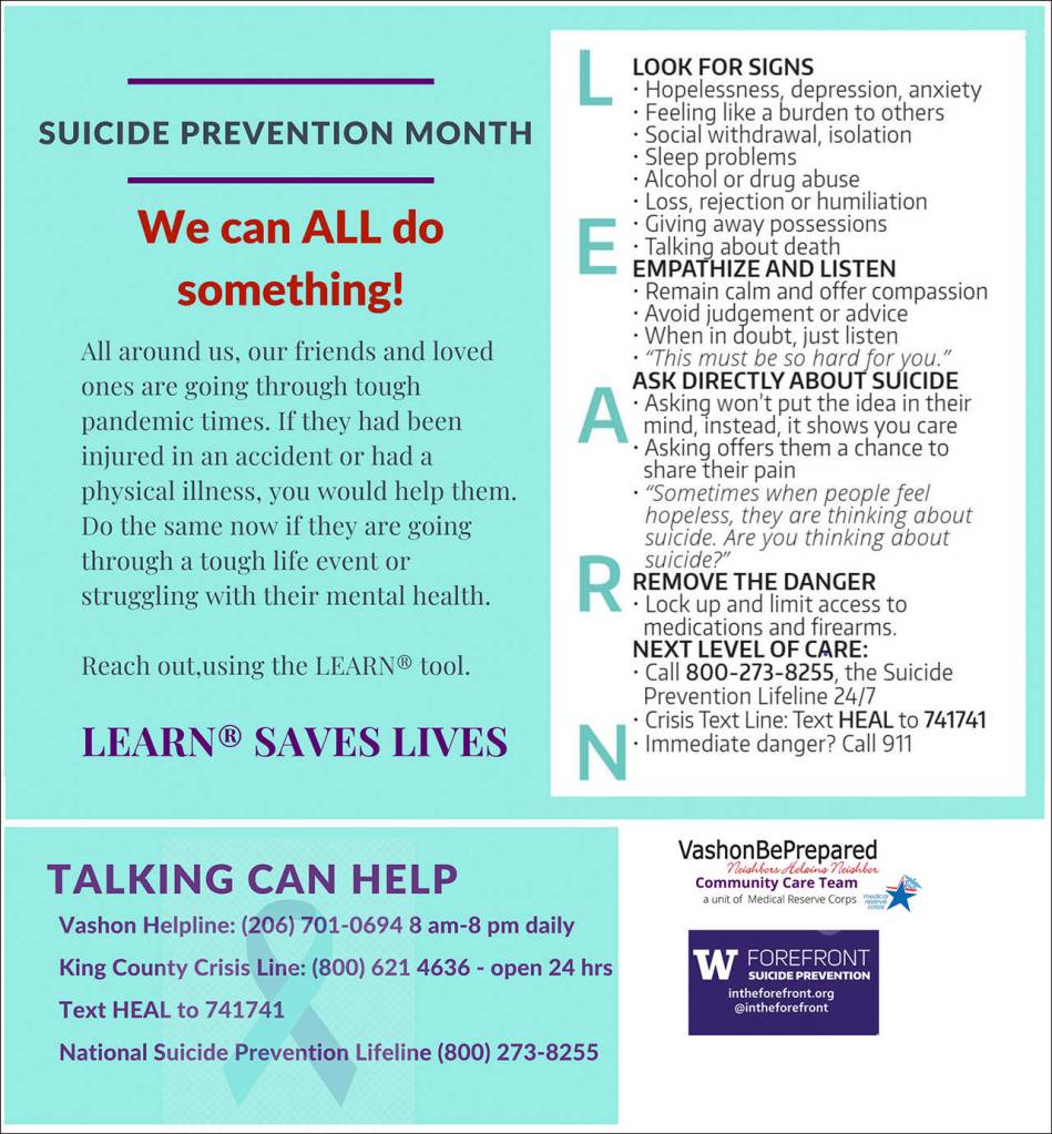 Community Care Team: Leadership of the Community Care Team, a unit of the Medical Reserve Corps, provided suicide prevention training to teachers and other staff at Vashon schools last week. The training based on the LEARN system, helps people look for signs that someone may be thinking about suicide, empathize by listening to them, and take action to remove the danger and get them to care. (See the postcard image on this page.)
