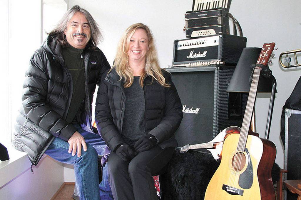 In this Beachcomber file photo from 2018, Pete Welch and Allison Shirk, of Vashon Events, smile for the camera in front of some of the many instruments that make up Vashon Events’ free lending library of musical instruments and gear (Susan Riemer Photo).