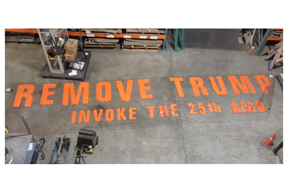 Members of Vashon’s Backbone Campaign activist group had brought their message to locations across the area, beginning early last Thursday morning to raise a banner over the Yesler Way overpass calling for the 25th amendment to remove the president for his part in invoking the mob. The banner is seen above in the group’s workshop on the island.
