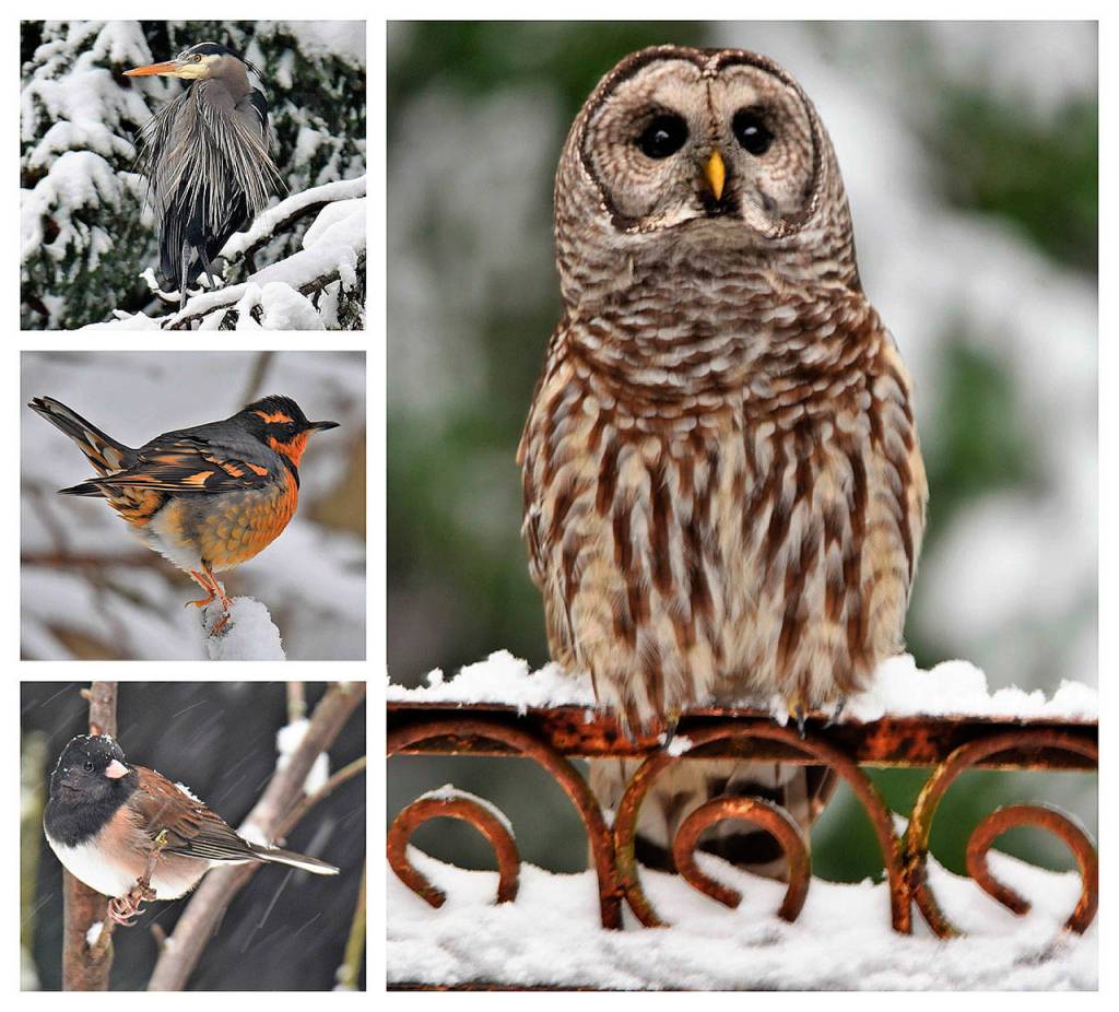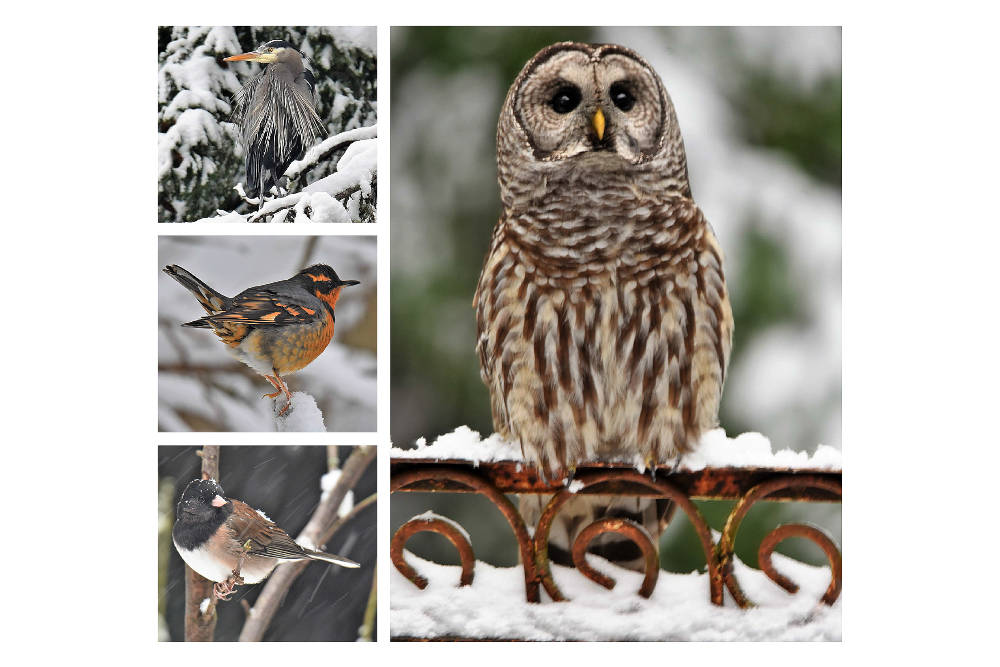 As Vashon was being blanketed by almost a foot of snow last weekend, island photographer Jim Diers set out to capture shots of beautiful birds, both great and small, that flitted, flew and sat sentinel in the silent, altered landscape. Here are a few of his photographs taken that day — of a Dark-Eyed Junco, a Varied Thrush, a Barred Owl and a Great Blue Heron, nestled in the treetops. For more snow-day photos from islanders, see page 9 of this week’s issue (Jim Diers Photos).