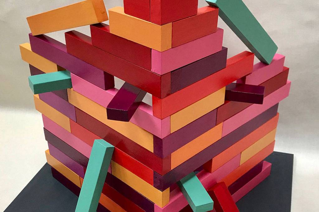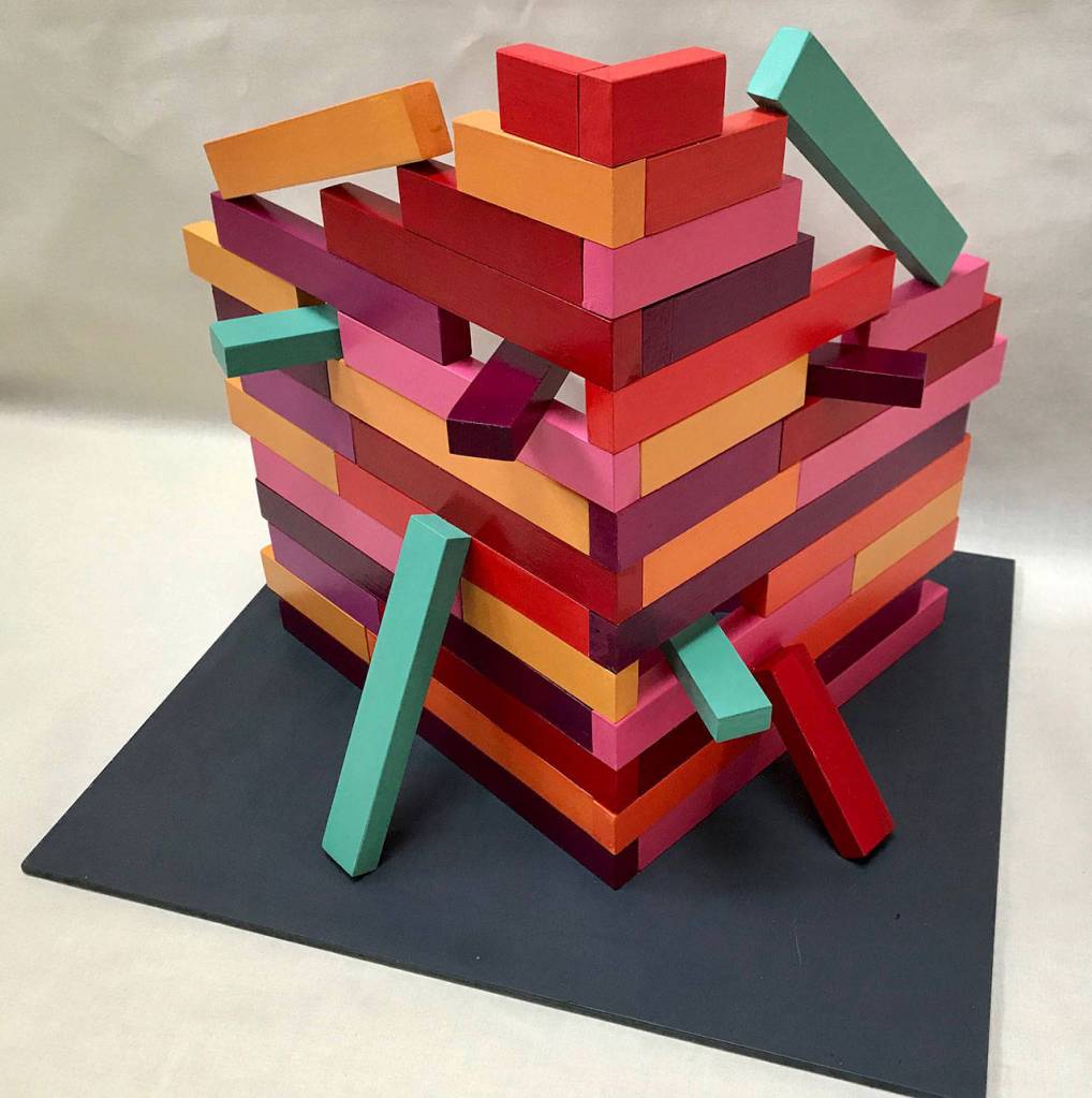 Judet created a sculpture inspired by Atwood’s line, “Get rid of death. Celebrate increase.” She said that her sculpture made of colorful blocks is about “rebuilding and doing more with less” — something that is on many people’s minds a year into the COVID pandemic.