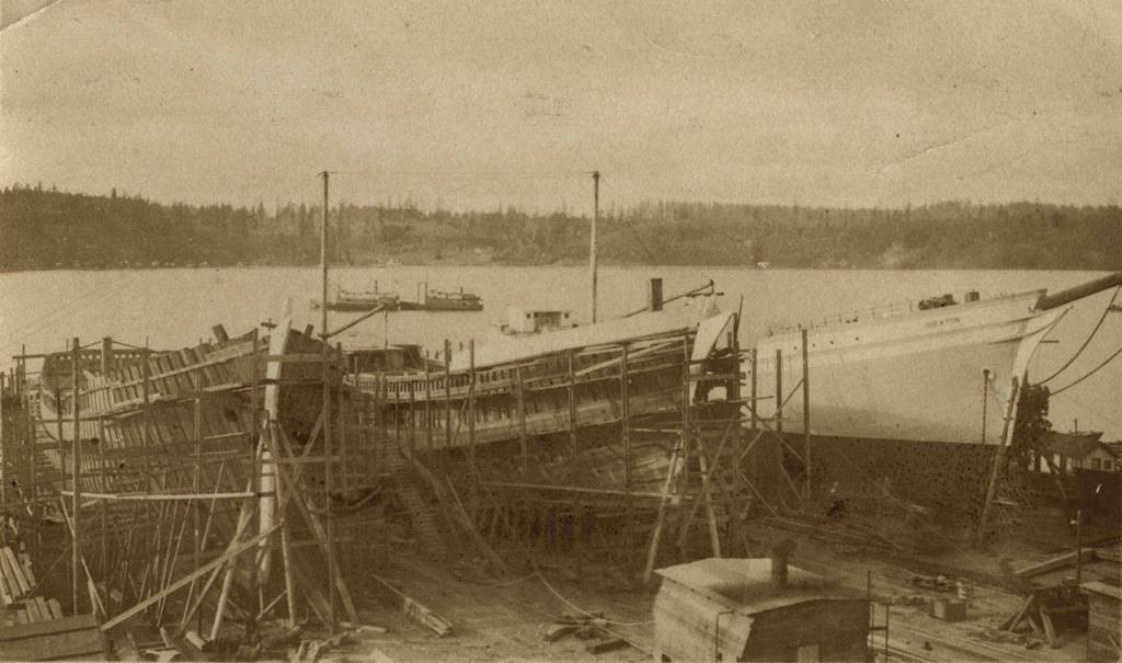 In 1917, Martinolich was contracted by the Norwegian government to build three large wooden topmast schooners that were 235-feet long and fore and aft rigged. To accommodate the construction of these large vessels, the Martinolich shipyard, along the west shore of Dockton, just south of Dockton Point and the Plancich Net Shed, was completely rebuilt to provide fully-planked ways capable of building all three ships simultaneously.