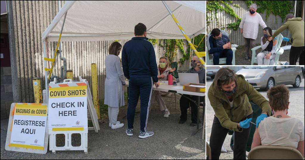 Vashon Pharmacy: The Pharmacy site has been converted to a hybrid traffic pattern. It can now easily switch between drive-through and walk-up vaccination services as needed, depending on the number of people who are expected on any given day for shots. The tent area just outside the Pharmacy has been expanded, to more comfortably provide shelter for injections and seating for the 15-minute required medical observation period. A walk-up greeter desk has been set up so that on walk-up days, patients do not need to drive through the greeter/staging area at the movie theater parking lot. Next week, there will be two days when walk-up patients will get vaccinated on an all-comers basis, with no appointment required. The Vashon Pharmacy appointment signup website has been open most of this past week for those who prefer to plan ahead to a specific time. Visit VashonPharmacy.com/COVID.