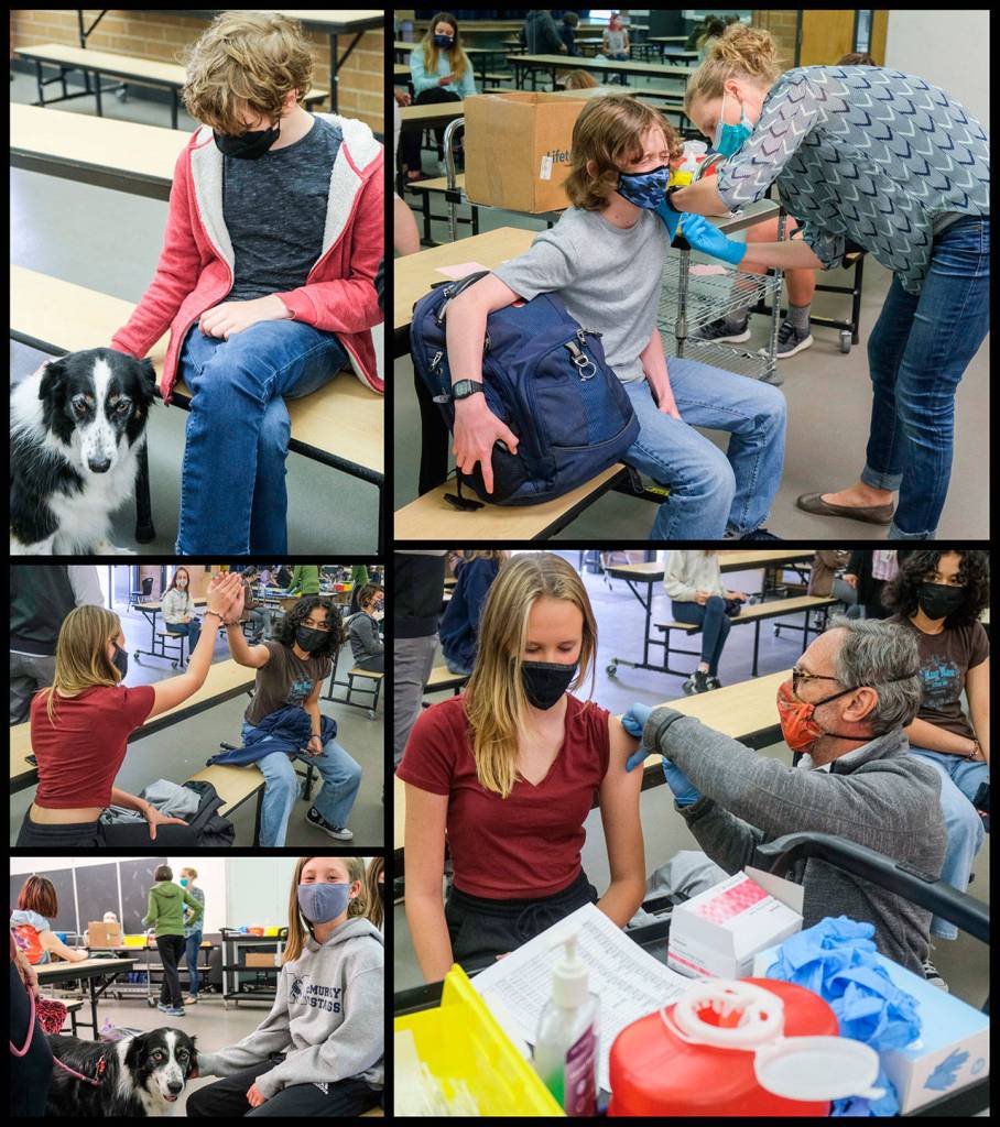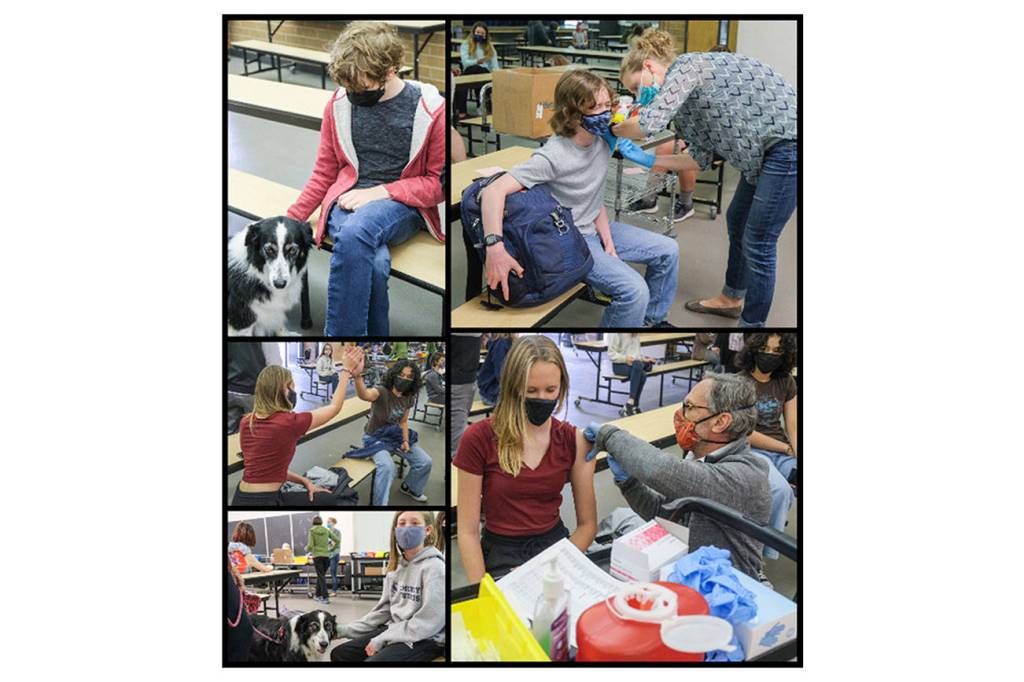 After receiving her shot, 6th-grader Marlowe Gamble petted Chia, a gentle therapy dog brought to the clinic by Community Care Team member Molly Purrington. Gamble, too, described the shot as “pretty painless,” and said she was looking forward to how her life would expand after she was fully vaccinated. “I’m excited to get to go and be around other people,” she said.