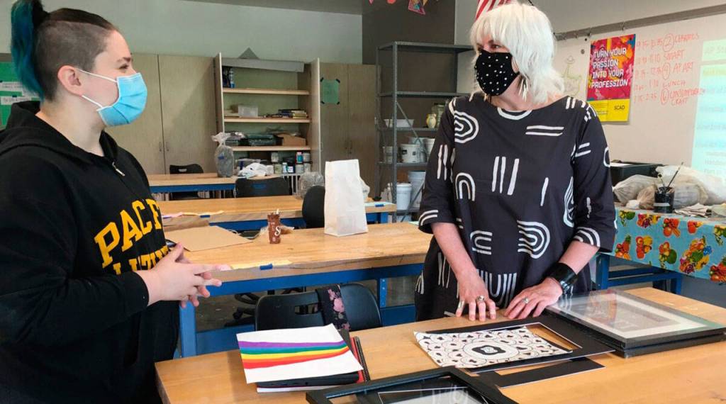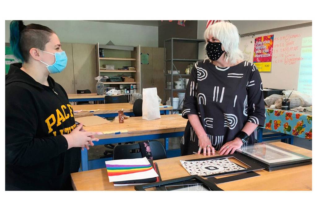 The brainchild of Lynann Politte, gallery director at Vashon Center for the Arts and Kristen Adams, art teacher at Vashon High School (VHS), the new approach is a practicum to teach students about the world of art outside the studio. Through a Vashon Artists in the Schools (VAIS) residency, Politte first provided the 19 students — juniors, seniors and a few sophomores — in Adams’ Advanced Placement (AP) art class with information about art careers in general, then focused on the requirements of an art gallery in particular.