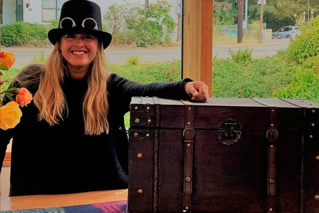 Jordan Balcom, a board member of Vashon Center for the Arts, shows off a steamer trunk filled with more than $2,500 worth of high-end items and experiences. The trunk is being raffled off as part of VCA’s annual art auction.