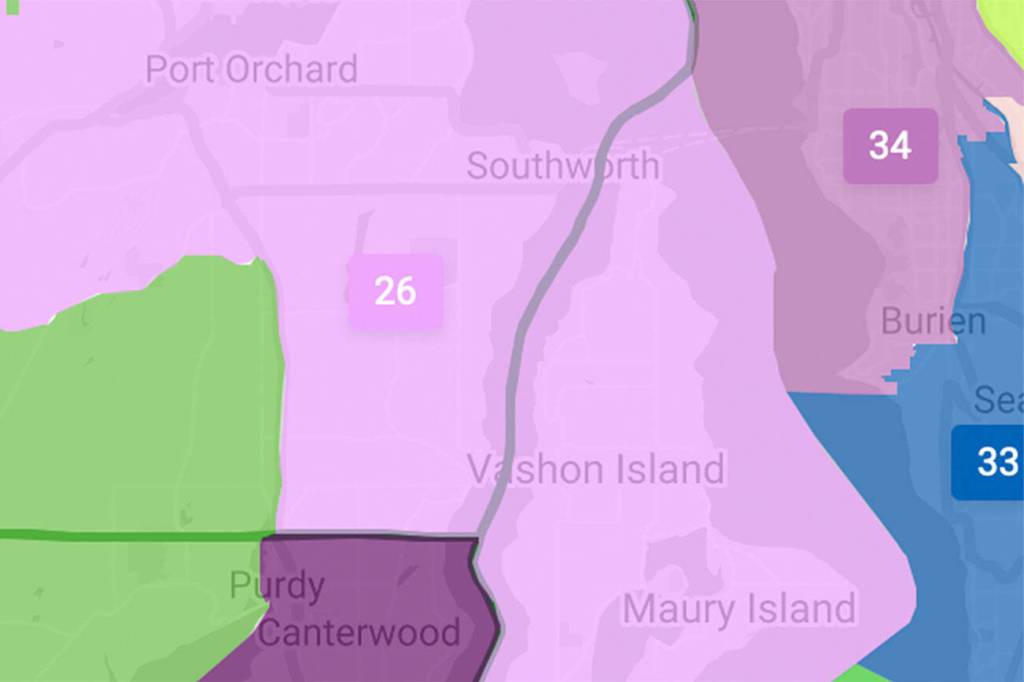 One of four competing maps moves Vashon from the 34th District, which is dominated by West Seattle, to a redrawn version of the 26th District, which currently stretches up the Kitsap from Gig Harbor to Bremerton.