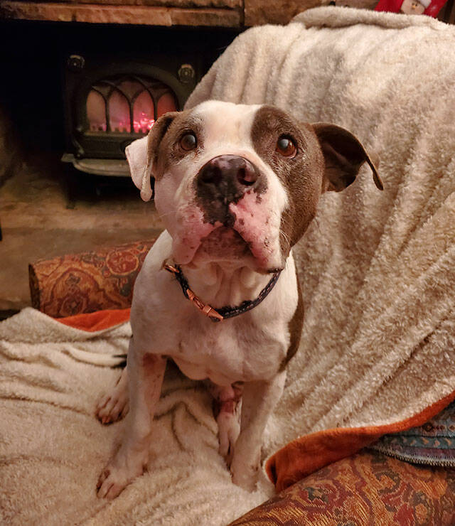 Like every pitbull we’ve ever known, Petey loves his comfort: he spends much of his day in an armchair by the fire, and he likes it when we cover him with a blanket. Being a California dog originally, he wasn’t wildly enthusiastic about the recent bout of snow, but he enjoys all the wonderful smells to be savored in the rural and woodland environment of Vashon, so very different from his experience on city streets.