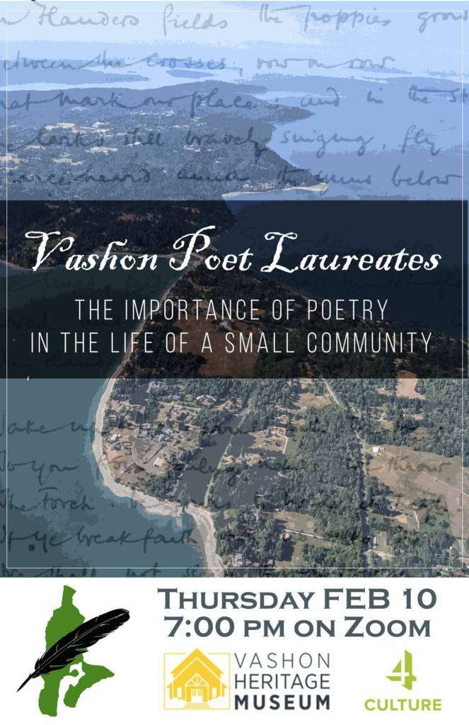 (Vashon Heritage Museum Graphic)	Ann Spiers, the island’s first Poet Laureate, and Sandra Noel, the current Vashon Poet Laureate, will provide a perspective on poetry on the island at 7 p.m. Thursday, Feb. 10, on Zoom.