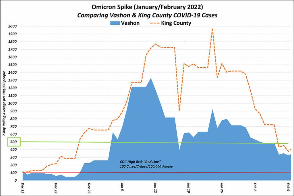 Ever since the pandemic began, the island’s COVID-19 case rate has been running well below King County as a whole. The gap narrowed somewhat over the last six weeks, but even during the record-setting Omicron spike, Vashon’s COVID case rate was lower than the county-wide rate, according to data from Public Health — Seattle & King County (PHSKC).
