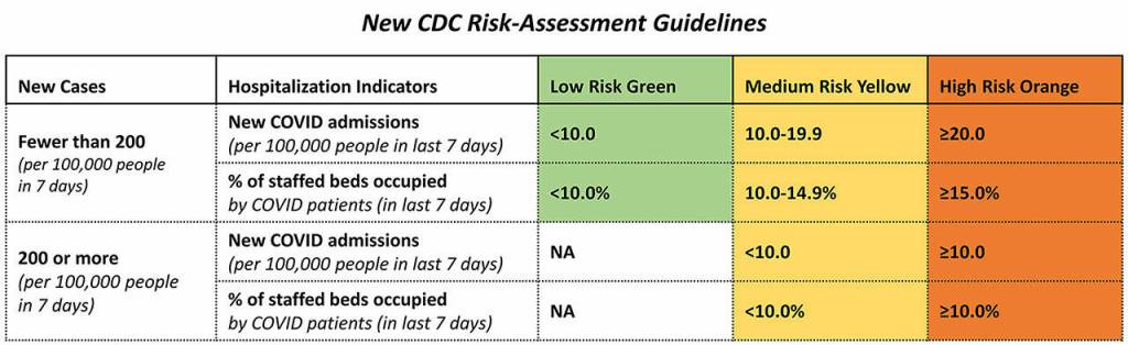 (Graphic courtesy VashonBePrepared) This table illustrates the new CDC risk-assessment procedure. The method first evaluates the number of new cases per 100,000 people in the past seven days. Next, the method evaluates the level of severe COVID disease (new COVID admissions) and a county’s ability to treat those patients (percentage of staffed beds occupied by COVID patients). Because the new method no longer sets the risk level based on the number of new cases alone, a county may be at a low (green) or medium (yellow) risk level under the new method, while it would have been at a high-risk level under the old method.