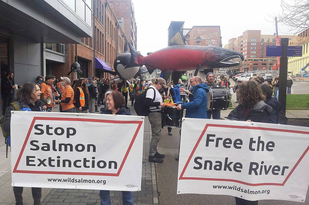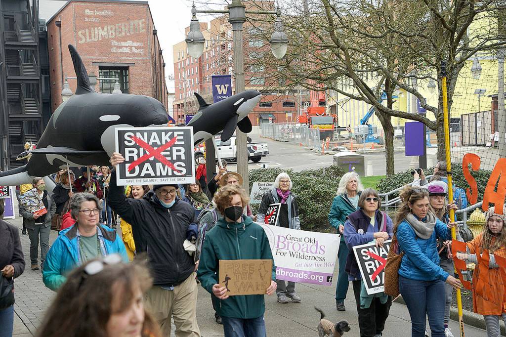 A spirited rally, complete with giant orca and salmon sculptures, took place on Saturday, March 26, starting at the University of Washington (UW) Tacoma, to urge lawmakers to restore the lower Snake River in southeast Washington State by removing its four dams to save its endangered salmon from extinction and help feed critically endangered Southern Resident orcas.