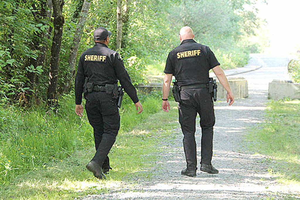 (Staff Photo) King County Sheriff’s Deputies Seth Moore and Glen Brannon in Island Center Forest, in 2018.