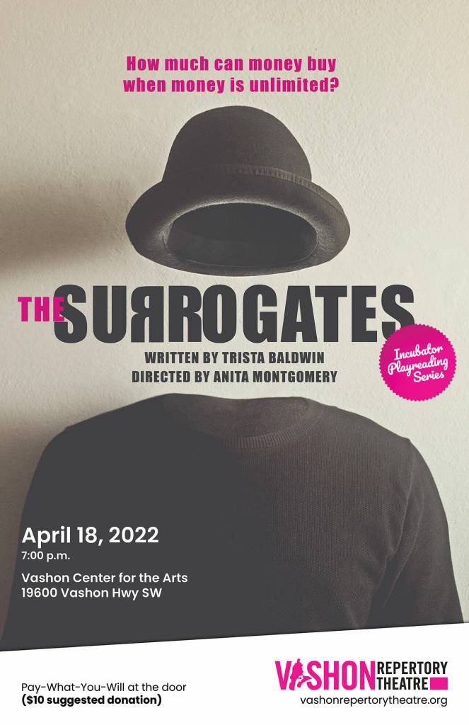 Baldwin’s play, “The Surrogates,” is up next in Vashon Repertory Theatre’s incubator play-reading series, at 7 p.m. Monday, April 18, in the lobby of Vashon Center for the Arts.