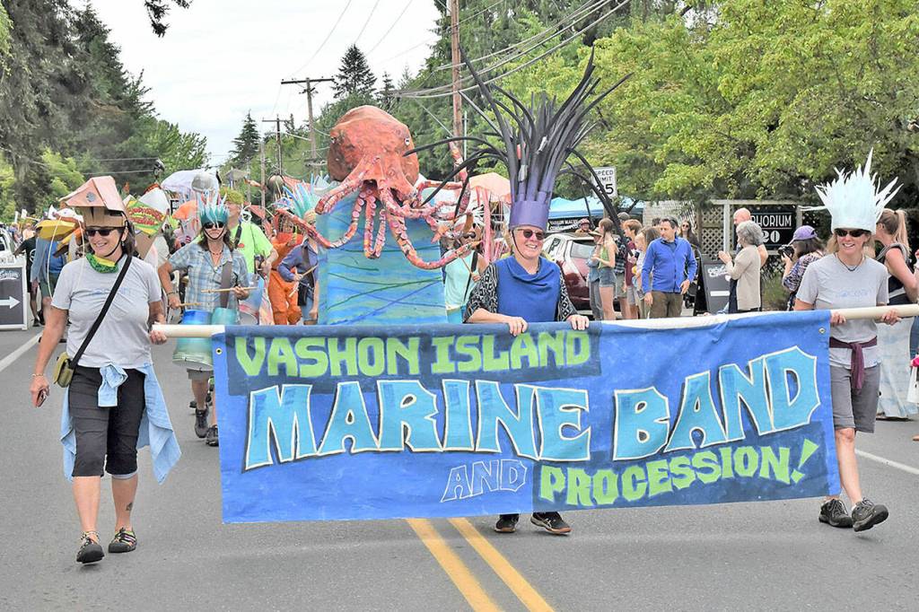And The Vashon Island Marine Band and Procession was born — a collection of artists, makers, musicians, and those who dance along, working with Nadine Edelstein at the First Sunday Styro and Plastic Recycle to build critters of the Salish Sea out of bubble wrap, paper mache and other castoffs. Mary Bruno put the word out to musician pals and — with plastic buckets, ex-drum-major Carol Kenefick, and six weeks of drilling — an awesome drum line was created.