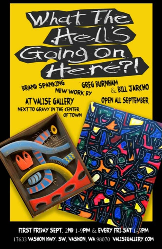 During the First Friday gallery cruise opening Friday, Sept. 2, at VALISE Gallery, there will be a two-person show by local artists Gregory Burnham and Bill Jarcho, “What the Hell’s Going on Here?!”