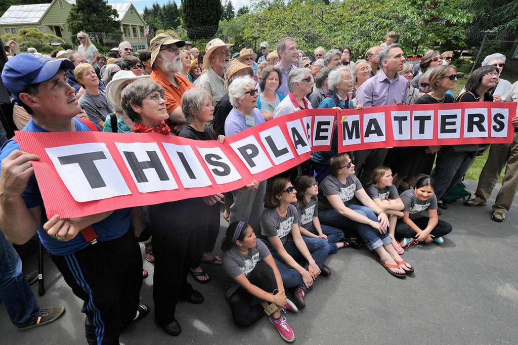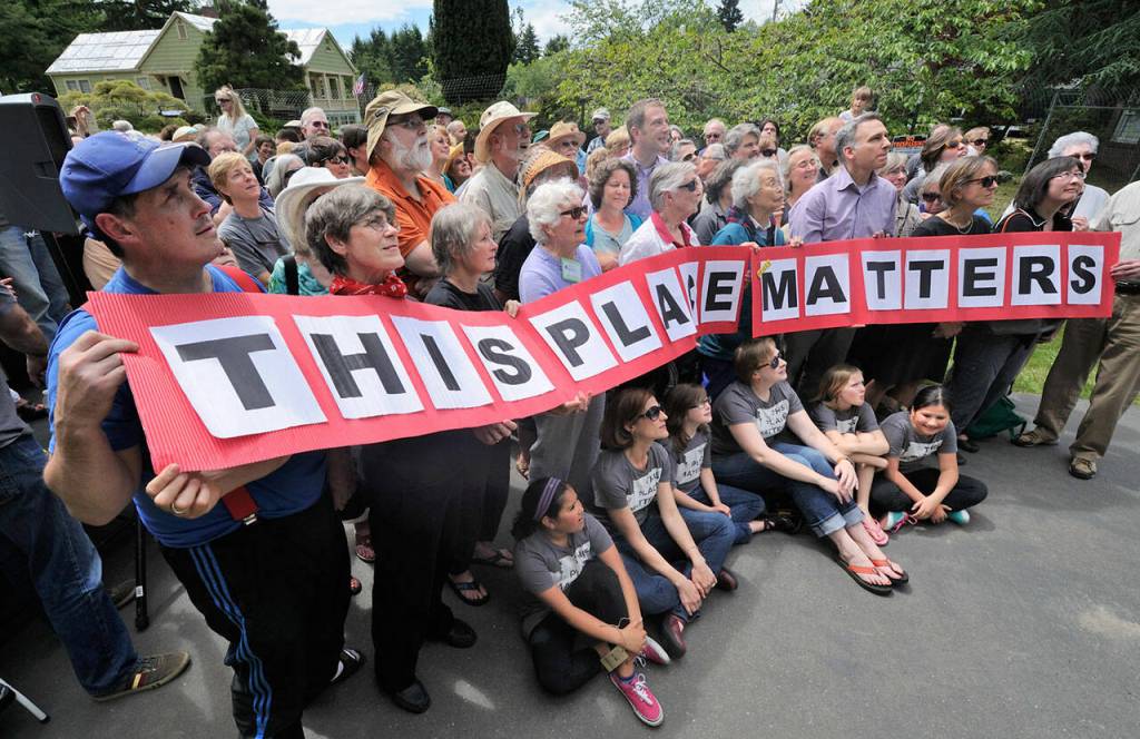 Helen Meeker (front standing row, fourth from left, in dark glasses) at the “This Place Matters” street gathering held on June 1, 2013. Meeker was deeply involved in the effort to put Mukai Farm & Garden back into the hands of the public. (Rick Wallace Photo)