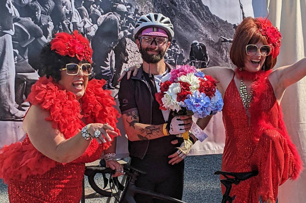 Finishing riders were greeted by a 50-foot red carpet borrowed from Open Space for Arts & Community, and a photo op with Vashon’s Famous Filson Sisters, otherwise known as Tami Brockway Joyce and Jennifer Potter.