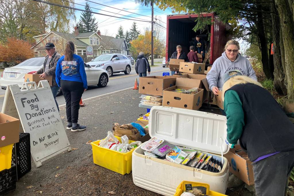 On Wednesday of last week, the tables were piled high with food, with many items suitable for a Thanksgiving feast, including ready-made pies, loaves of bread, bags of potatoes, fresh fruit and vegetables, as well as a jumbo-sized cooler filled with meat