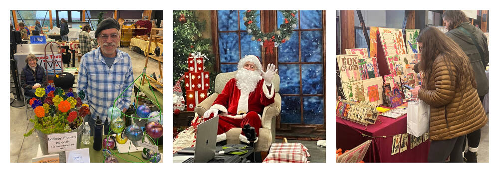 From left to right: Glass artist Brian Brenno and his mother, Diane Brenno, Santa, and shoppers perusing more than 50 booths were all seen and heard at Jingle Bash, a holiday market held last weekend at Vashon High School (Tom Hughes Photos).