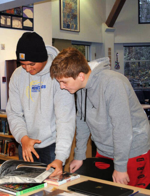 McMurray Middle School seventh-graders Luis Nunez Hernandez (left) and Jack Parker check out a book after a lesson on the Dewey Decimal System (Photo courtesy of PIE).