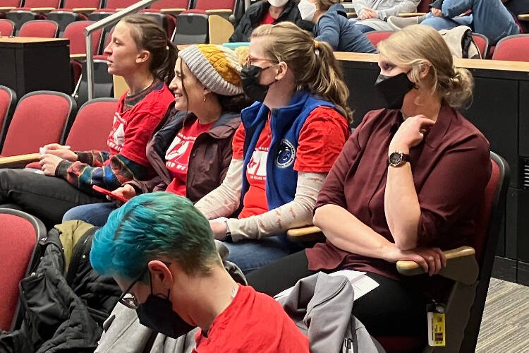 Some of the teachers, wearing red shirts to signal their union affiliation, were also in the audience at the Feb. 16 meeting.