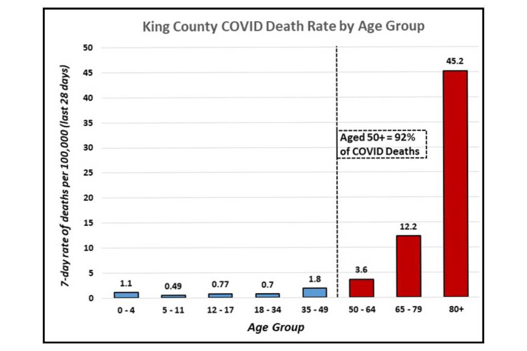 King County matches the national statistics: over 90% of COVID deaths in the county occur among people aged 50 or older, according to Public Health – Seattle & King County (PHSKC).