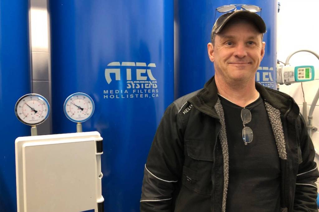 “It is so basic,” said Stoltz. “Just these four steel canisters —two feet in diameter, six feet tall — filled with green sand and charcoal.” Manganese and iron adhere to the green sand, which is actually dark grey in color and looks like tiny beads of activated charcoal.