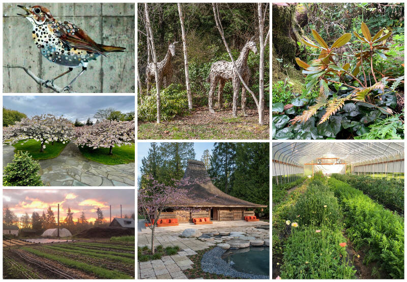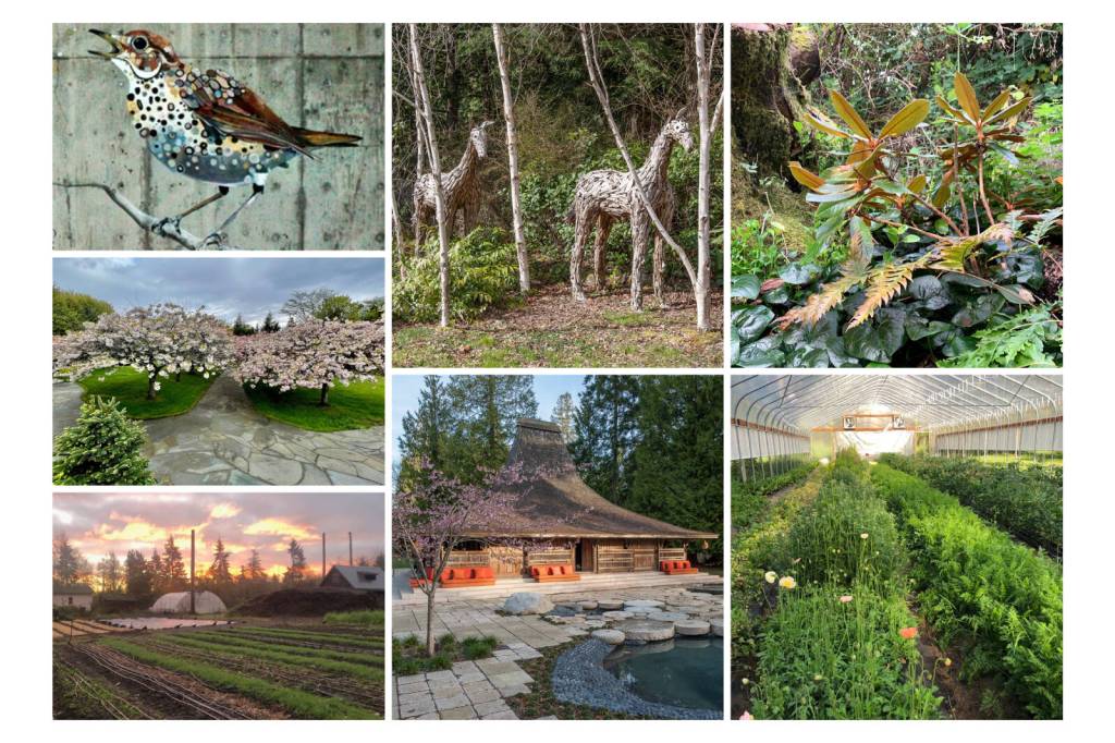 (Top left) A stunning mural by island artist Britt Freda welcomes visitors to VCA’s Heron Meadow (Top center) Two metal horse sculptures grace the wooded entry to the property of Liz and Mike McConnell (Top right) Janice Goucher’s secret garden is filled with meandering trails and Northwest native plants (Middle left) LaSalle Reserve’s “Cherry Blossom Alley” (Bottom left) Forest Garden Farm is a working farm steeped in historical and cultural significance (Bottom center) Two stunning, imported buildings from Asia adorn the McConnell property (Bottom right) Inside a hoop house, at Forest Garden Farm (Courtesy Photos).