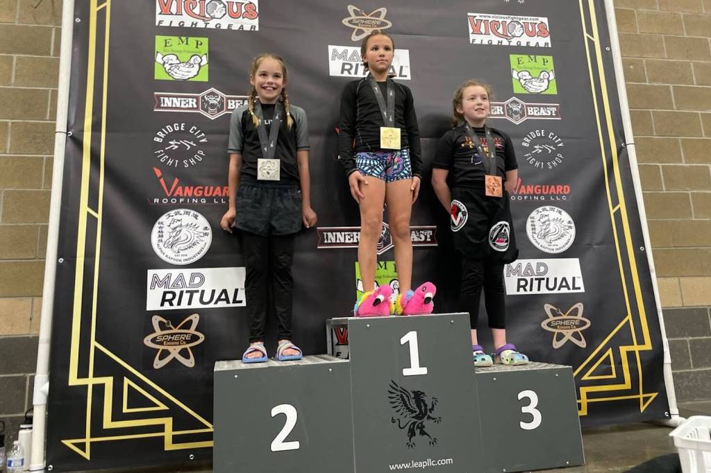 The Dodd family brought home four medals. Lovela Dodd earned first place gold in a girls youth no-gi division, and her brother, Bidziil Dodd, earned a bronze third place in a scrappy boys gi division. Coach and father Bobby Dodd earned two gold medals in both the gi and no-gi men’s blue belt divisions.