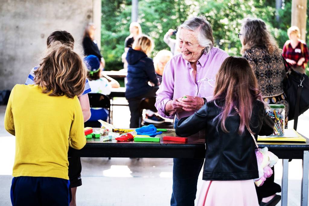 Islander Yvonne Kuperberg, who participated in a pen pal project pairing third-graders with island seniors, was all smiles last week as she and students participated in a crafting project (Dawn Stief Photo).