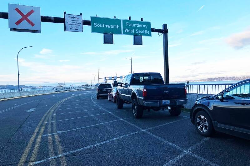 In this photo, taken in January, cars waited on Vashon’s dock in the late afternoon, with no boat in sight (Elizabeth Shepherd Photo).