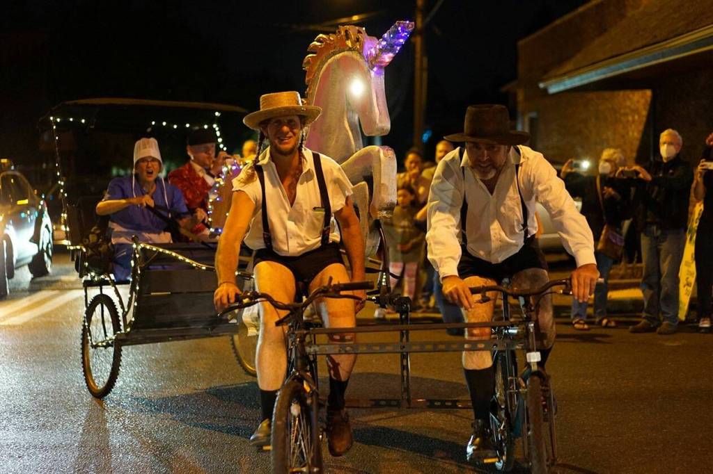 This year’s parade — the 10th annual edition of the event — will feature dozens of riders once again tooling through town on outlandish forms of tricked-out, lit-up, pedal-powered means of transportation.