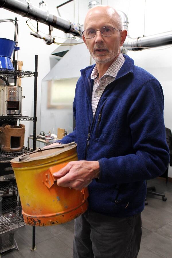 Burn Design Lab Executive Director Paul Means holds a stove that was made by hand; an impressive feat of manual engineering, but one that’s difficult to produce at scale, Means said (Photo by Alex Bruell).