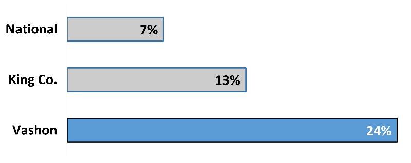 This graph shows Vashon’s vaccination rate for the 2023-2024 version of the vaccine compared to mainland King County and the U.S. as a whole (Data from Public Health — Seattle King County.).