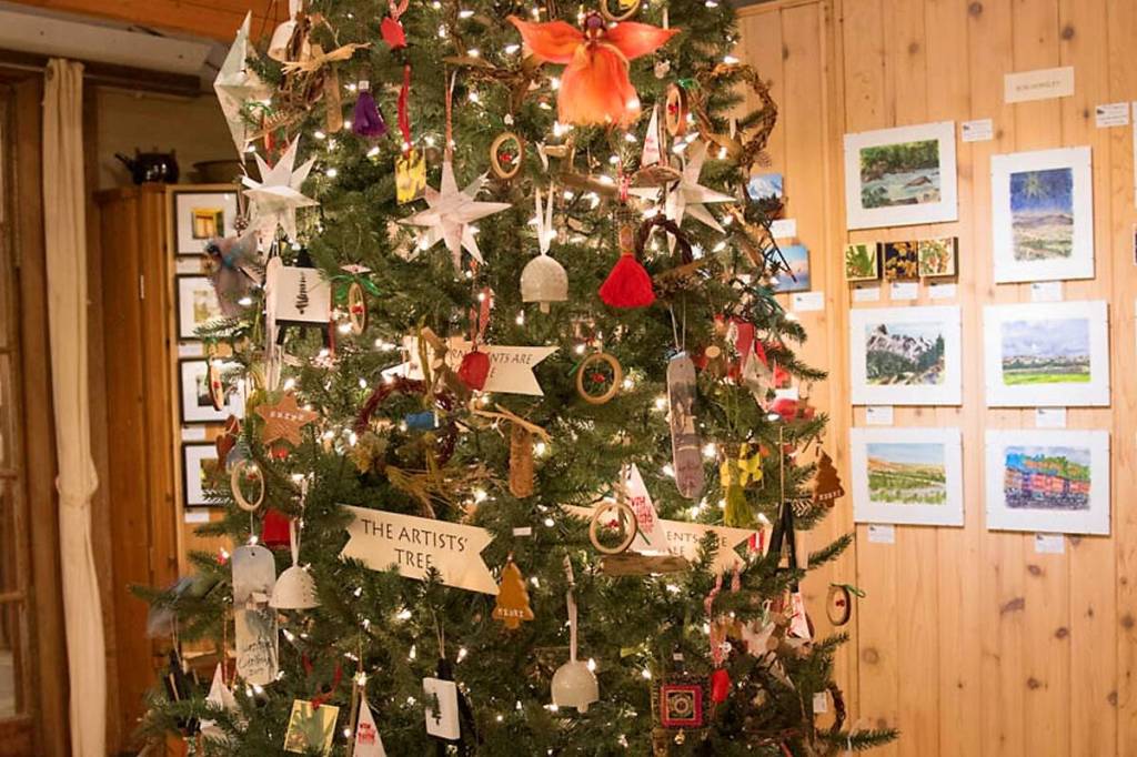 An “artist’s tree” stands just inside the studio’s door — a dazzling evergreen festooned with lights and small, inexpensive artworks by each member of the Waterworks collective (Courtesy Photo).