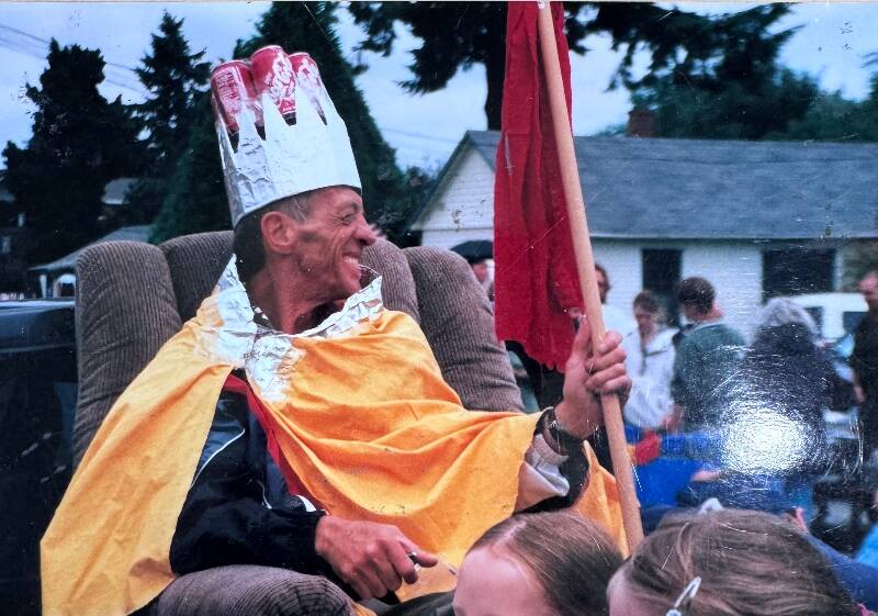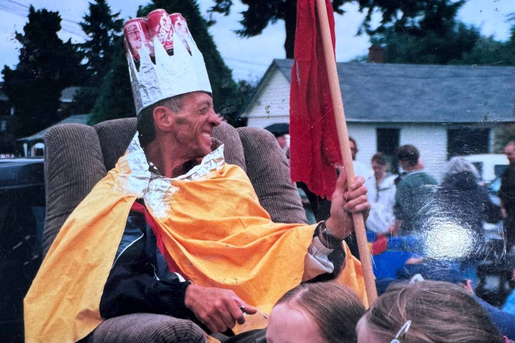 After members of the Vashon Island Chamber of Commerce helped Glenn establish a small but successful business recycling aluminum cans, Glenn even achieved status as unofficial royalty on the island, riding in Strawberry Festival parades as the “King of Cans,” for many years, while smiling and waving to the crowd.