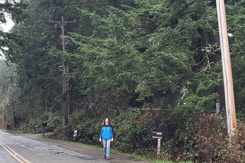 Towering Douglas firs line Jenny Bell’s property on 115th Ave S.W., trees that she says are now under threat because of a Puget Sound Energy project to improve the electrical grid on this heavily forested stretch of roadway.
