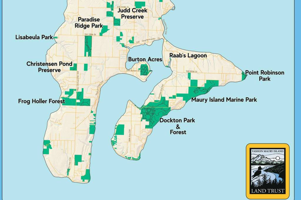 In total, nearly 3,000 acres of Vashon-Maury are now preserved for public park use. King County owns the most (2,100 acres), while the Vashon Park District holds about 555 acres and Land Trust holds about 333.