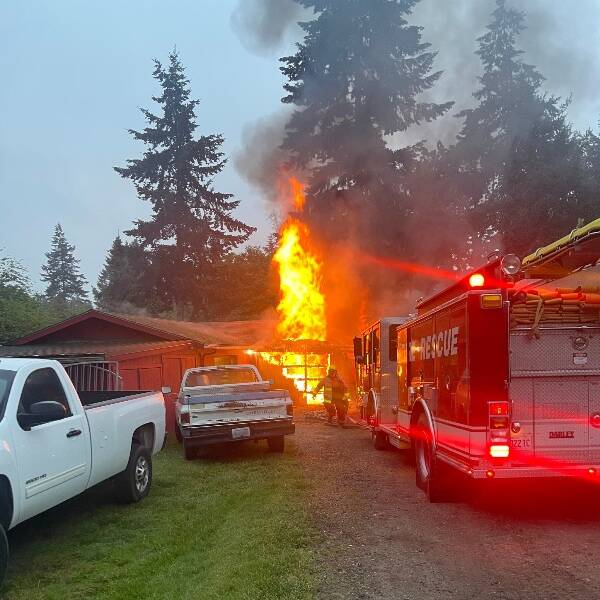 In the early morning of May 16, VIFR and King County Medic One crews were dispatched to the 7200 block of 240th St SW, on Maury Island, where a large, L-shaped garage containing a shop area had caught fire.
