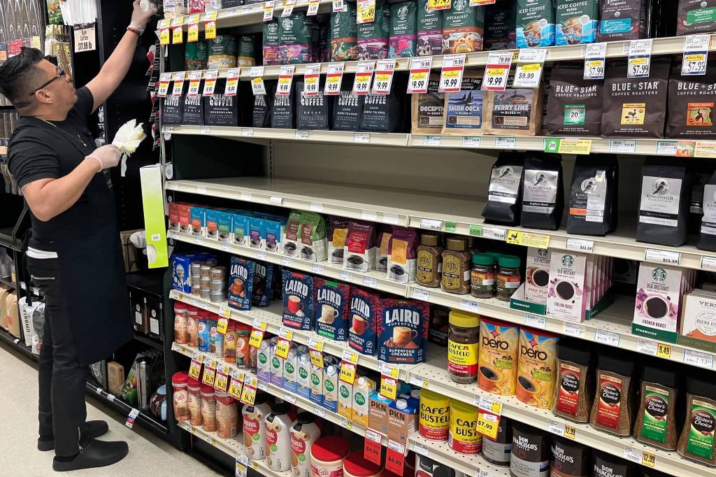 Last week, a store worker cleaned the coffee aisle of Thiftway near the empty spot where Monastery Blend Coffee had been displayed (Elizabeth Shepherd Photo).