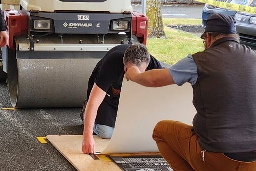 Artists steamrolling linocut prints at the WAZGoose Festival in Tacoma. Quartermaster Press artists will offer the same artmaking event on June 28, in the parking lot of the Blue Heron Education Center. (Michael Darr photo)