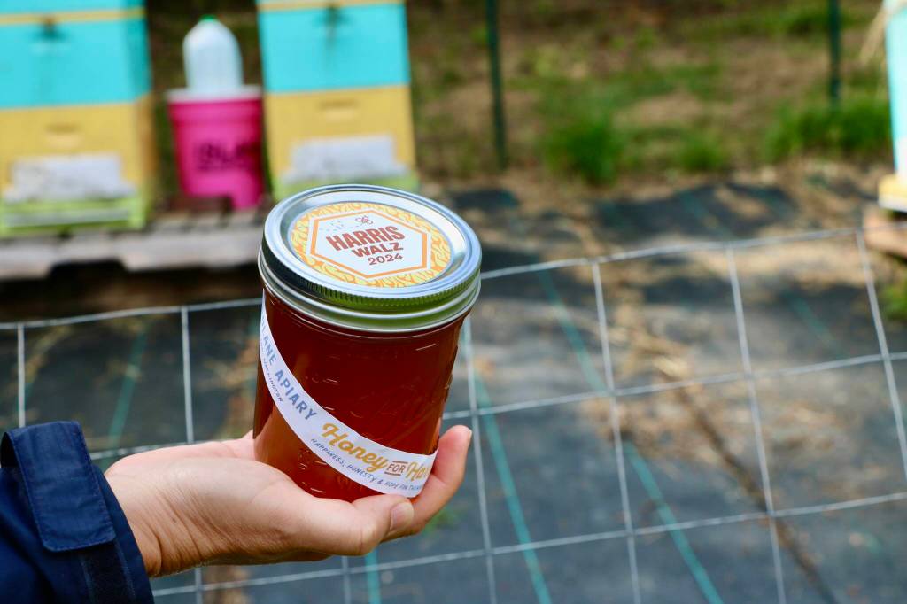 Islander Jenna Riggs delivers these jars of her harvested honey to encourage others to donate directly to the Kamala Harris campaign. (Aspen Anderson photo.)