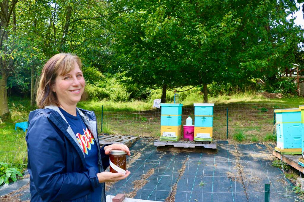 Islander Jenna Riggs holds a jar of honey next to her hives on Vashon Island.